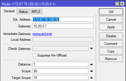 2add disabled=yes distance=1 dst-address=172.67.74.128/32 gateway=10.20.0.1 pref-src=0.0.0.0 routing-table=main scope=30 suppress-hw-offload=no target-scope=10