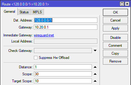 3add disabled=no distance=1 dst-address=128.0.0.0/1 gateway=10.20.0.1 pref-src="" routing-table=main scope=30 suppress-hw-offload=no target-scope=10