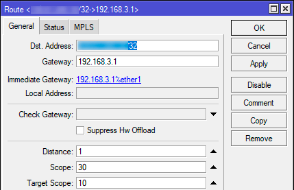 2add disabled=no dst-address=x.x.x.x/32 gateway=192.168.3.1 routing-table=main suppress-hw-offload=no