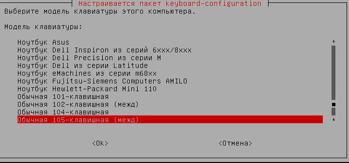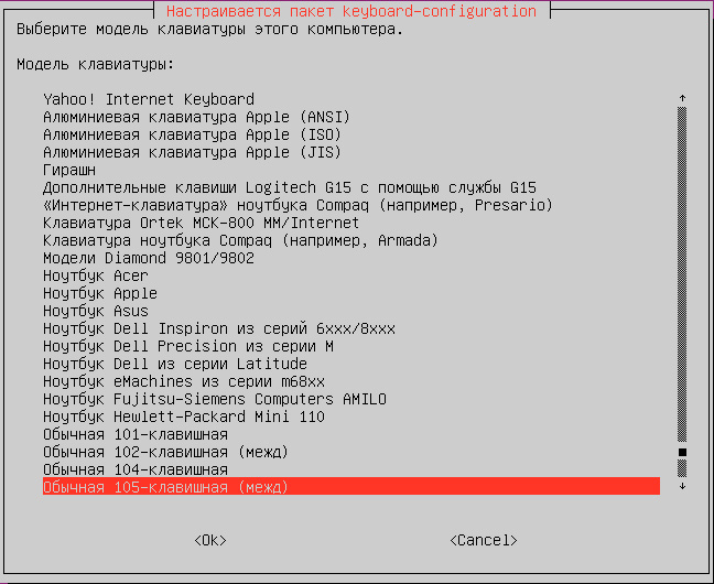 Выбираем тип клавиатуры, по умолчанию это 105-клавишная международная, менять эту настройку без особой необходимости не следует.