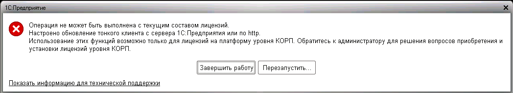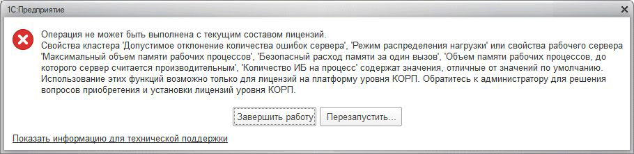 Операция не может быть выполнена с текущим составом лицензий. Свойства кластера 'Допустимое отклонение количества ошибок сервера', 'Режим распределения нагрузки' или свойства рабочего сервера 'Максимальный объем памяти рабочих процессов', 'Безопасный расход памяти за один вызов', 'Объем памяти рабочих процессов, до которого сервер считается производительным', 'Количество ИБ на процесс' содержат значения, отличные от значений по умолчанию. Использование этих функций возможно только для лицензий на платформу уровня КОРП. Обратитесь к администратору для решения вопросов приобретения и установки лицензий уровня КОРП.