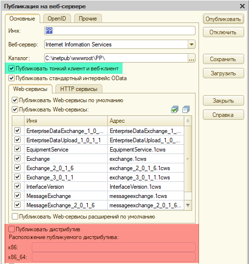 В частности, это относится к настройкам Публиковать дистрибутив, которые не следует путать с опцией Публиковать тонкий клиент и веб-клиент, если вы снимите этот флажок, то подключение к базе тонким и веб-клиентом будет невозможно.