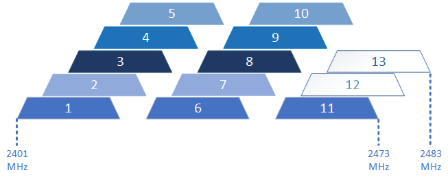 | Центральная частота,МГц | 2412 | 2417 | 2422 | 2427 | 2432 | 2437 | 2442 | 2447 | 2452 | 2457 | 2462 | 2467 | 2472 |