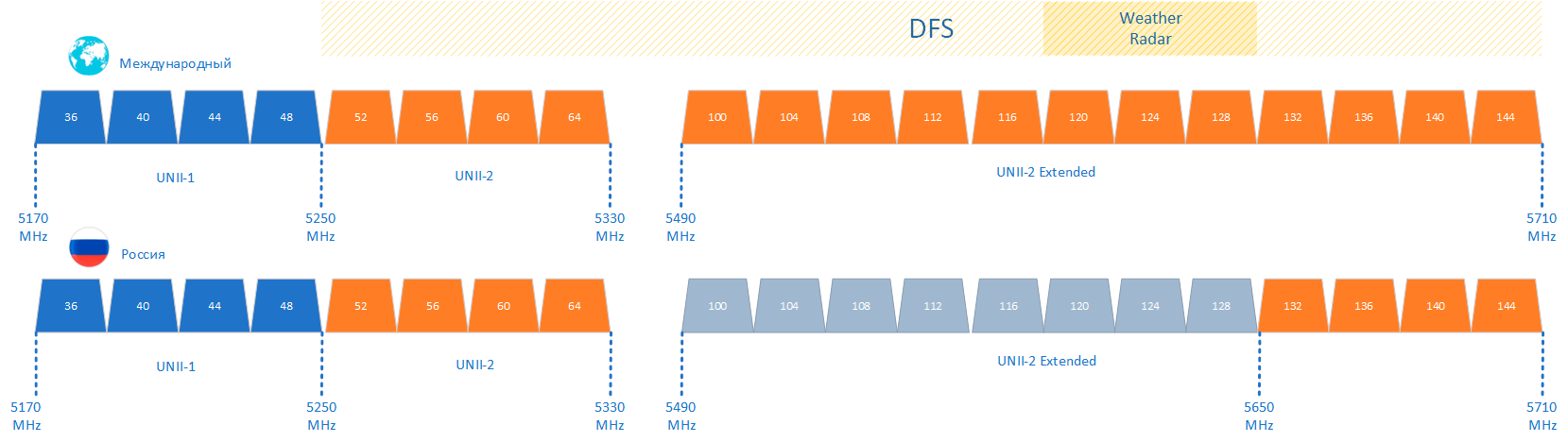 В России на текущий момент времени из диапазона UNII-2 Extended разрешено использование только четырех каналов 132-144, что дает нам следующую конфигурацию: 8 последовательных каналов в UNII-1 и UNII-2 и отдельно отстоящие от них по частотам 4 канала UNII-2 Extended. Это дает возможность использовать 6 каналов шириной 40 МГц, три канала шириной 80 МГц (каждый такой канал занимает полосу целиком) и один канал шириной 160 МГц, объединив полосы UNII-1 и UNII-2. Однако возможность его использования остается под вопросом, так как UNII-2 работает в полосе частот радаров. Эта же особенность может сделать затруднительной и использование каналов шириной 80 МГц на всю ширину полосы UNII-2 или UNII-2 Extended.
