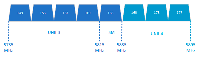 Как мы уже говорили, 5 ГГц - это не единый диапазон, а целый ряд диапазонов, порядок использования которых в различных странах может отличаться. Выделяемые для нелицензируемой работы полосы частот называются UNII (Unlicensed National Information Infrastructure, Нелицензируемая национальная информационная инфраструктура).