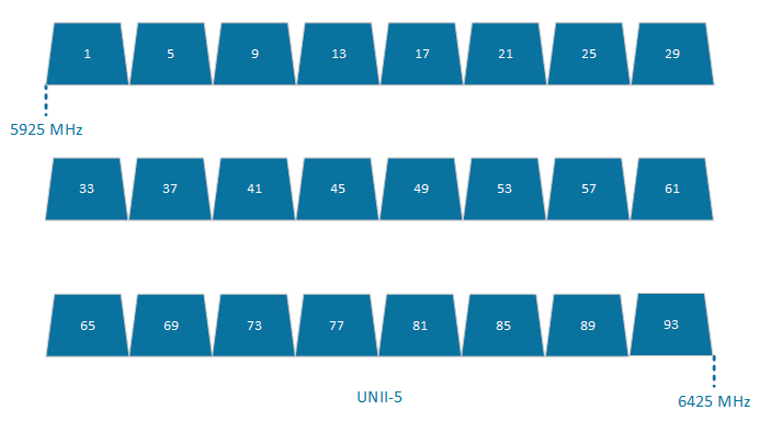 Новый диапазон для беспроводной связи в полосе частот 5925 МГц - 7125 МГц и включающий в себя четрые полосы UNII-5 - UNII-8. Частотная сетка предусматривает использование только непересекающихся каналов шириной 20 МГц и с шагом 20 МГц, от начала и конца полосы частотный отступ составляет 30 МГц. При этом допускается использование широких каналов 40, 80 и 160 МГц.