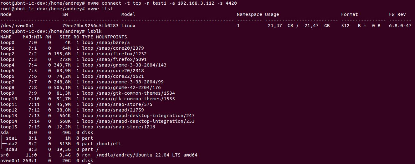 Теперь у нас есть подсистема test, которое содержит пространство имен с номером 1 с которым сопоставлен физический диск**/dev/nvme0n1**.