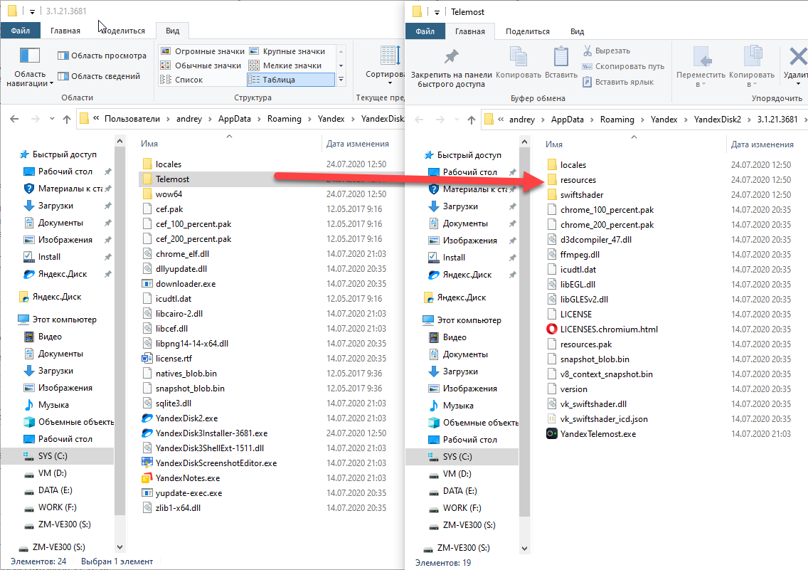 Также не являются правдой слова о том, что Телемост - компонент Яндекс.Диска. В этом несложно убедиться. Если открыть папку приложения, то мы увидим там сам Диск, приложения для скриншотов и заметок, а также библиотеки к ним. Телемост поставляется в отдельной вложенной папке со своими библиотеками и имеет вид отдельного приложения.