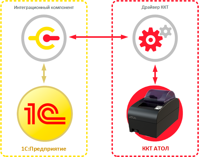 Для преобразования этих команд в команды понятные конкретному типу оборудования и требуется интеграционный компонент, который является частью драйвера торгового оборудования и разрабатывается либо его производителем, либо самой компанией 1С. Драйвер торгового оборудования для 1С может иметь одно- или двухкомпонентную архитектуру. Однокомпонентные драйвера непосредственно работают с физическим оборудованием, например, драйвера сканеров штрих-кода, двухкомпонентные поставляются только виде интеграционного компонента и для полноценной работы требуют наличия драйвера производителя оборудования. Драйвера ККТ с передачей данных выполнены по двухкомпонентной схеме.