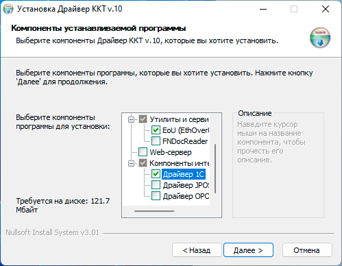 Хорошо, давайте теперь установим основную поставку. Минимально необходимая версия драйвера для работы с маркировкой для тех, кто еще не перешел на ФФД 1,2 -10.7.0.0, ее и установим. В процессе установки разверните пункт Компоненты интеграции и установите флажок Драйвер 1С, это скопирует архив с новым интеграционным компонентом в папку установки драйверов АТОЛ. Не забывайте, что разрядность драйвера ККТ должна совпадать с разрядностью платформы 1С:Предприятия. Если же вы забыли установить этот флаг, что интеграционные компоненты можно найти в полном архиве драйвера ККТ в папке 1С под наименованием ATOL_KKT_10.zip.