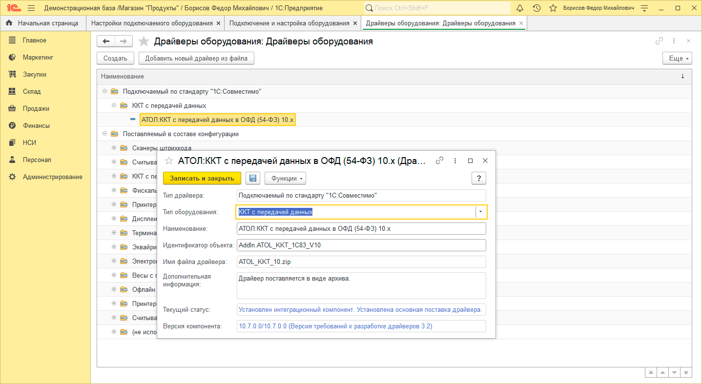 Но если мы снова откроем справочник Драйверы оборудования, то увидим там что версия драйвера и интеграционного компонента не совпадают, это приведет к тому, что несмотря на актуальный релиз, нужную версию драйвера и прошивки ККТ ваша касса не будет соответствовать требованиям законодательства, так как, по сути, вы продолжите работать с драйвером 10.6.2.0.