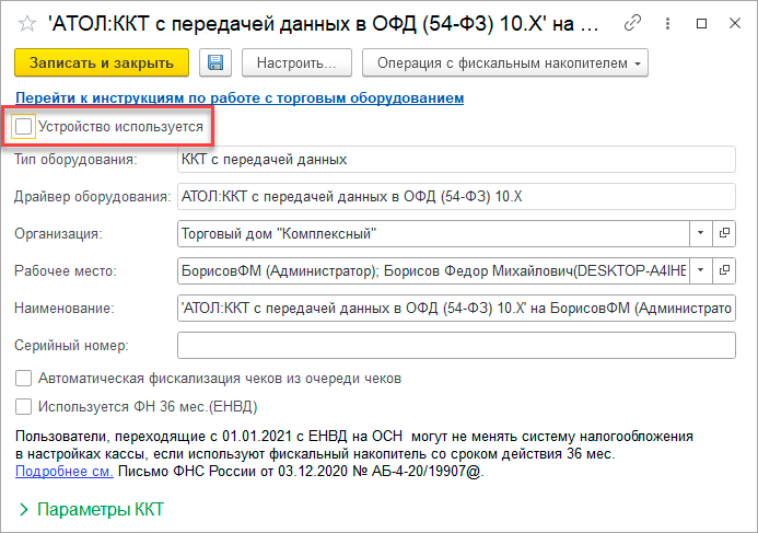 Успех? Не совсем, потому что созданный экземпляр ККТ продолжает использовать встроенный в конфигурацию драйвер, отключим его, для чего зайдем в свойства экземпляра и обязательно снимем флаг Устройство используется.