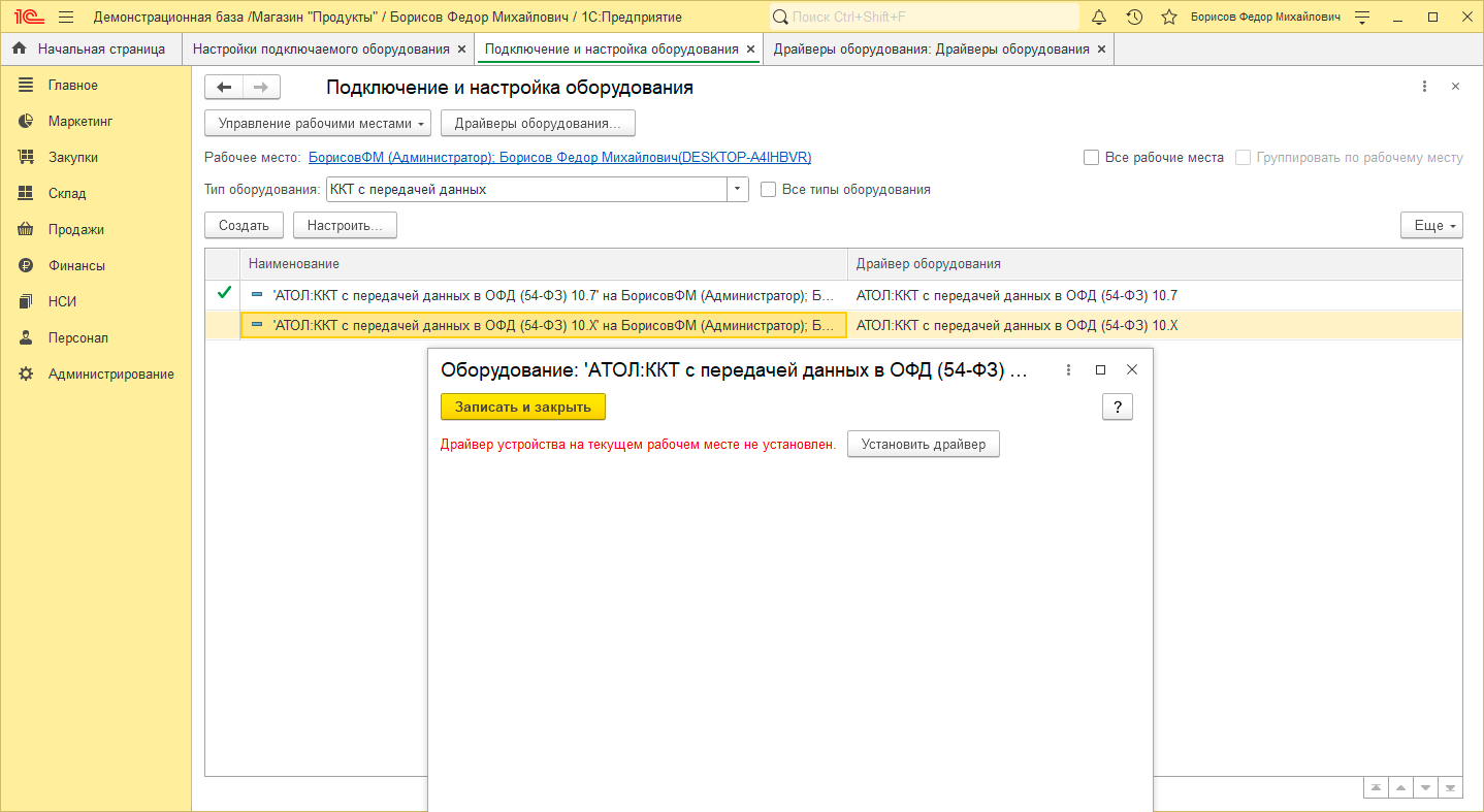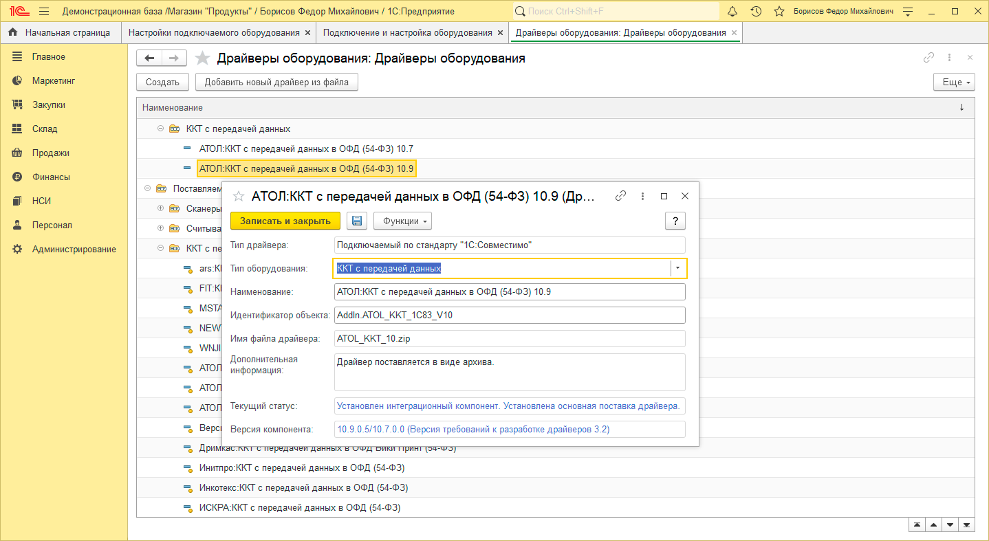 Теперь еще раз обновим драйвер ККТ до последнего на момент написания статьи 10.9.0.5, не забываем установить вместе с драйвером интеграционный компонент. Снова переходим в справочник Драйверы оборудования, загружаем новый драйвер и видим уже вполне ожидаемую картину - несовпадение версии драйвера и компонента.
