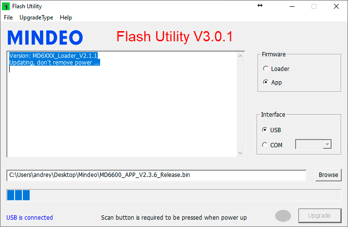 Затем запускаем утилиту обновления и указываем в ней: Firmware - APP, Interface - USB и путь к скачанному файлу прошивки, после чего нажмите клавишу Upgrade, во время обновления не отключайте сканер от ПК.