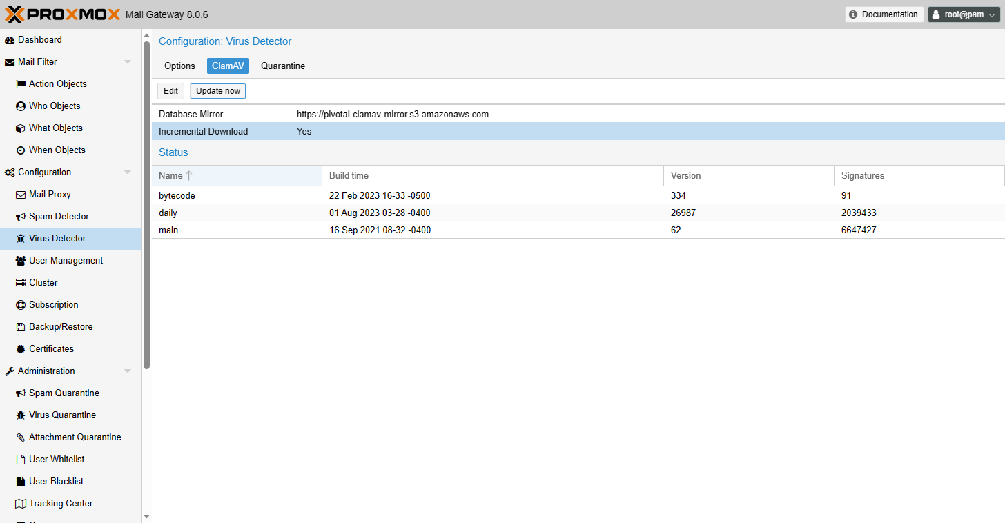 Если ваш сервер находится в юрисдикции РФ, то может потребоваться заменить адрес зеркала ClamAV, так как официальные зеркала заблокированы для пользователей из РФ. Для этого перейдите в Configuration - Virus Detector - ClamAV и в строке Database Mirror укажите зеркало:
