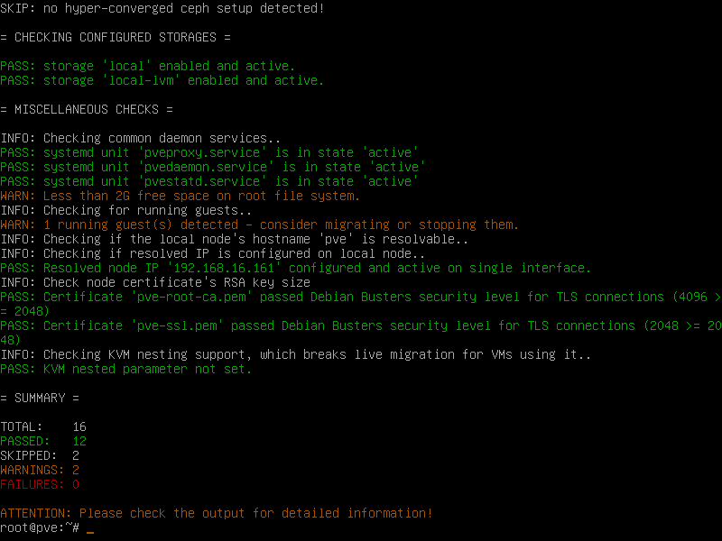 Его следует проанализировать и устранить все ошибки и предупреждения. При этом везде, где это необходимо, коротко указывается решение проблемы. В нашем случае было получено два предупреждения: менее 2 ГБ свободного места в корневой ФС и наличие запущенной виртуальной машины.