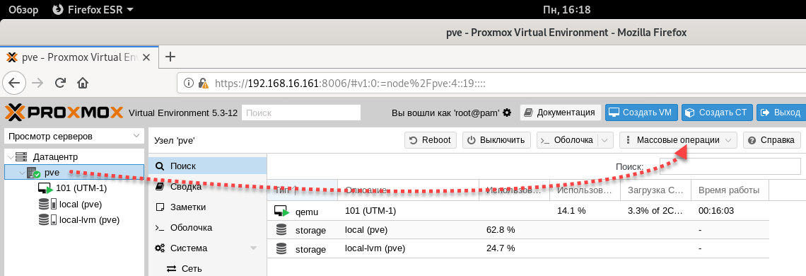 Запущенные виртуальные машины следует либо выключить, либо передать на другую доступную ноду. Обратите внимание, что требуется именно выключение VM, а не приостановка (пауза) ее состояния. Если виртуальных машин много, то сразу все их можно выключить через Массовые операции на уровне ноды.