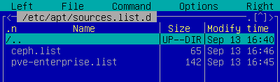 После чего обязательно загляните в /etc/ apt/sources.list.d и замените версию ОС в дополнительных подключенных репозиториях. В нашем случае это оказались репозиторий Proxmox без подписки (в нашем случае был изменен адрес в файле репозитория по подписке) и репозиторий Ceph.