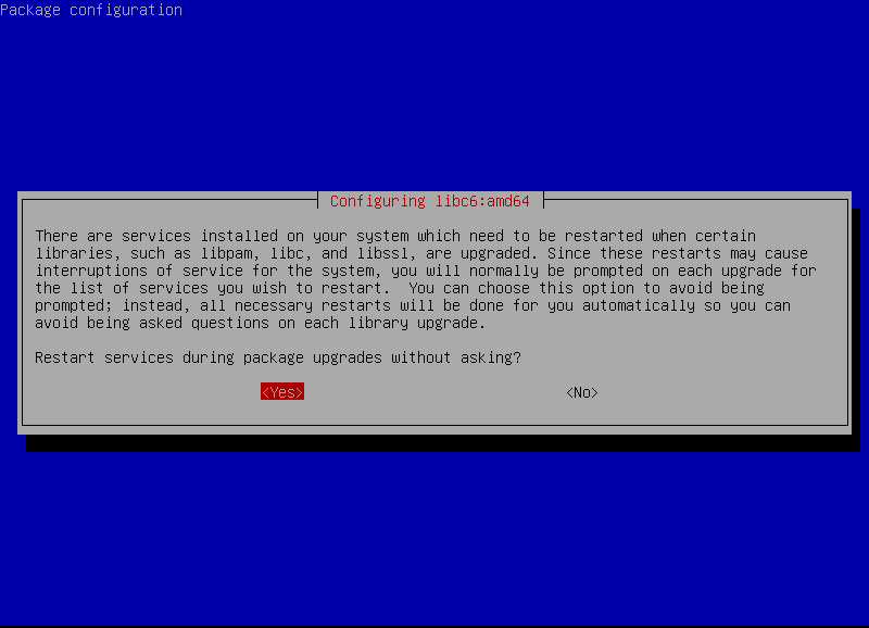 На вопросы о перезаписи конфигурационных файлов следует ответить НЕТ, это действие по умолчанию, достаточно при появлении запроса нажать Enter, а вот автоматический перезапуск служб наоборот следует разрешить.
