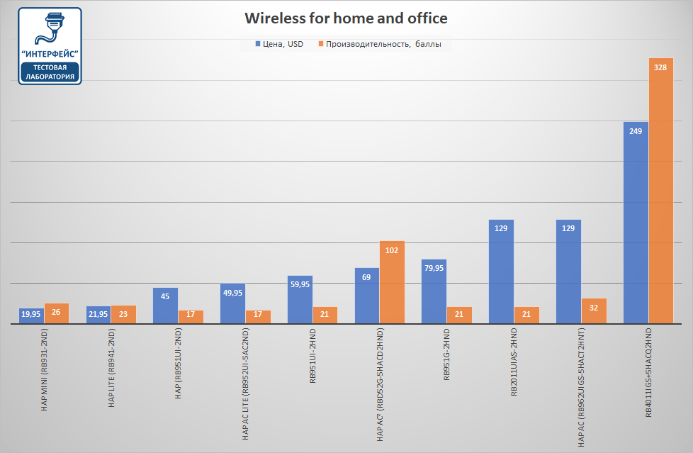 Но сравнение будет не полным без данных о производительности, эти данные можно найти на сайте компании в описании устройств, но просто сравнивать их в табличном виде неудобно, поэтому мы, взяв за основу официальные данные, нормировали их и привели к неким абстрактным величинам ("попугаям"), за эталон приняли, немного округлив цифры, производительность популярной старшей модели RB3011. Вместе со значениями рейтинга мы привели на графике официальную стоимость устройств.