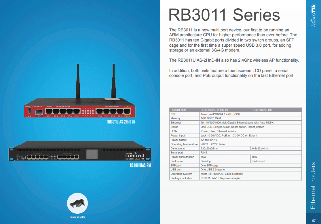 Теоретически, RB3011 должен быть стать основой нового семейства, на замену RB2011, но что-то пошло не так и сегодня доступна единственная модель в стоечном исполнении, хотя в свое время в каталоге были представлены и настольные модели. Скорее всего все дело в цене, Новые устройства однозначно вышли бы дороже RB2011, но многим их высокая производительность оказалась бы просто не нужна.
