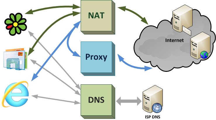 В данном случае реализована схема с прозрачным прокси. Перед тем, как обратиться к какому либо узлу сети интернет, любое приложение посылает запрос DNS-серверу, который в ответ на доменное имя сообщает соответствующий ему IP-адрес. DNS-сервер может представлять собой как локальный сервер, так и кэширующий DNS или программную заглушку пересылающую DNS-запросы вышестоящему серверу. В любом случае DNS-сервер для разрешения имен интернет ресурсов обычно использует вышестоящие DNS-сервера: провайдера (ISP) или публичные службы, типа OpenDNS, Google DNS и т.п.