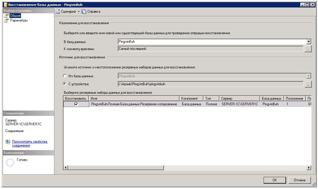 В открывшемся окне в Назначение для восстановления укажем В базу данных и выберем PingvinBuh, а в Источник для восстановления выберем С устройства и укажем путь к нашему архиву с БД PingvinBuh. Не забудем отметить выбранный архив галкой Восстановить в Выберите наборы резервных данных для восстановления.