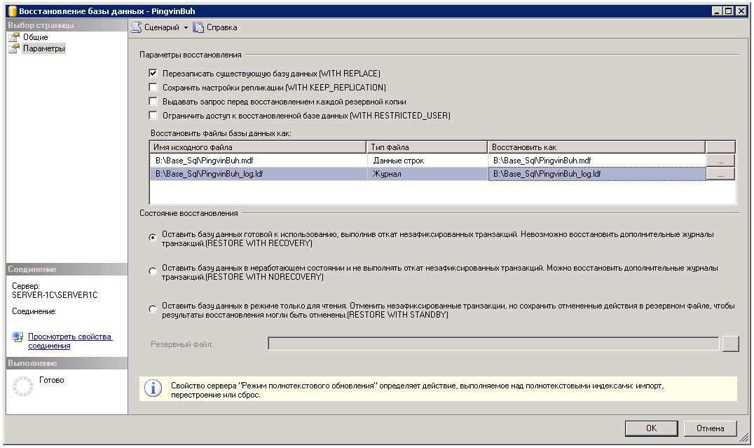 В Параметрах восстановления укажем Перезаписать существующую базу данных (WITH REPLACE). Обратим внимание на возможность выбора места. Пути исходных файлов должны быть такие же, как и у новой созданной вами базы. Т.е. при восстановление мы просто запишем поверх этой пустой базы нашу потерянную. Состояние восстановления можно оставить по-умолчанию: Оставив базу данных готовой к использованию, выполнив откат незафиксированных транзакций.