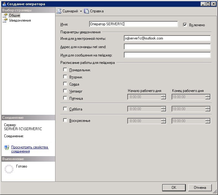 Для начала необходимо создать оператора в Microsoft SQL Server. Для этого зайдем в среду Microsoft SQL Server Management Studio, перейдем к Агенту SQL Server и в папке Операторы произведем создание оператора. Дадим ему имя, укажем адрес электронной почты. Именно на этот адрес будут приходить все уведомления от MS SQL.