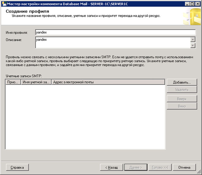 Пропускаем информационное окно и переходим к выбору действий по установке и настройке компонента Database Mail. Выбираем Установить компонент Database Mail. Вводим имя профиля и добавляем учетную запись SMTP.
