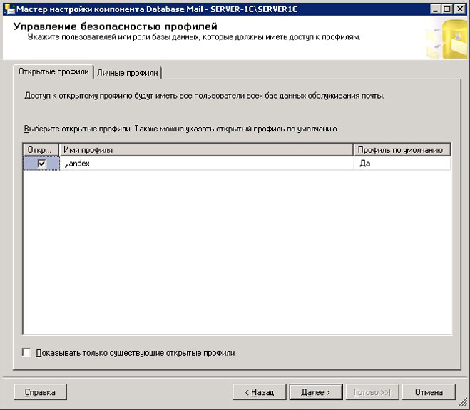 В следующем окне установим профиль по умолчанию и сделаем его открытым.