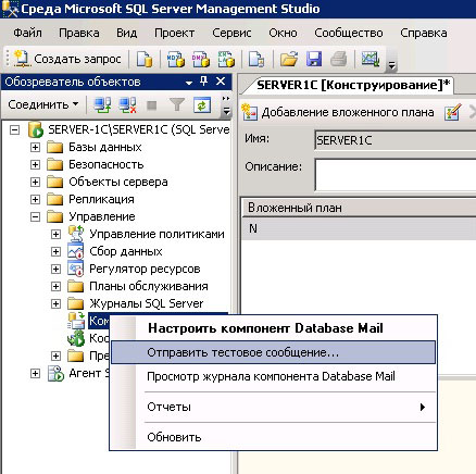 В обозревателе объектов SERVER-1C\SERVER1C выберем Управление, затем Компонент Database Mail. В Свойствах компонента выбираем пункт - Настроить компонент Database Mail.