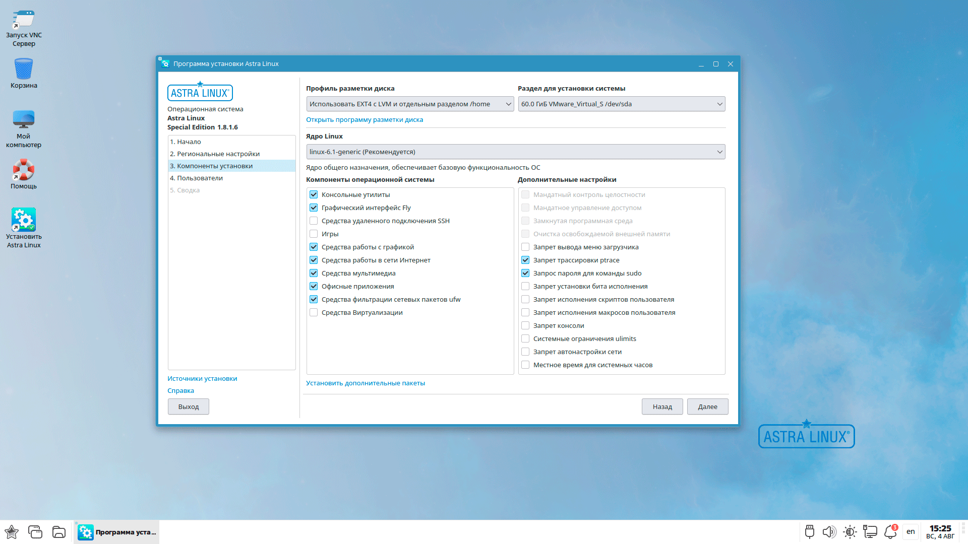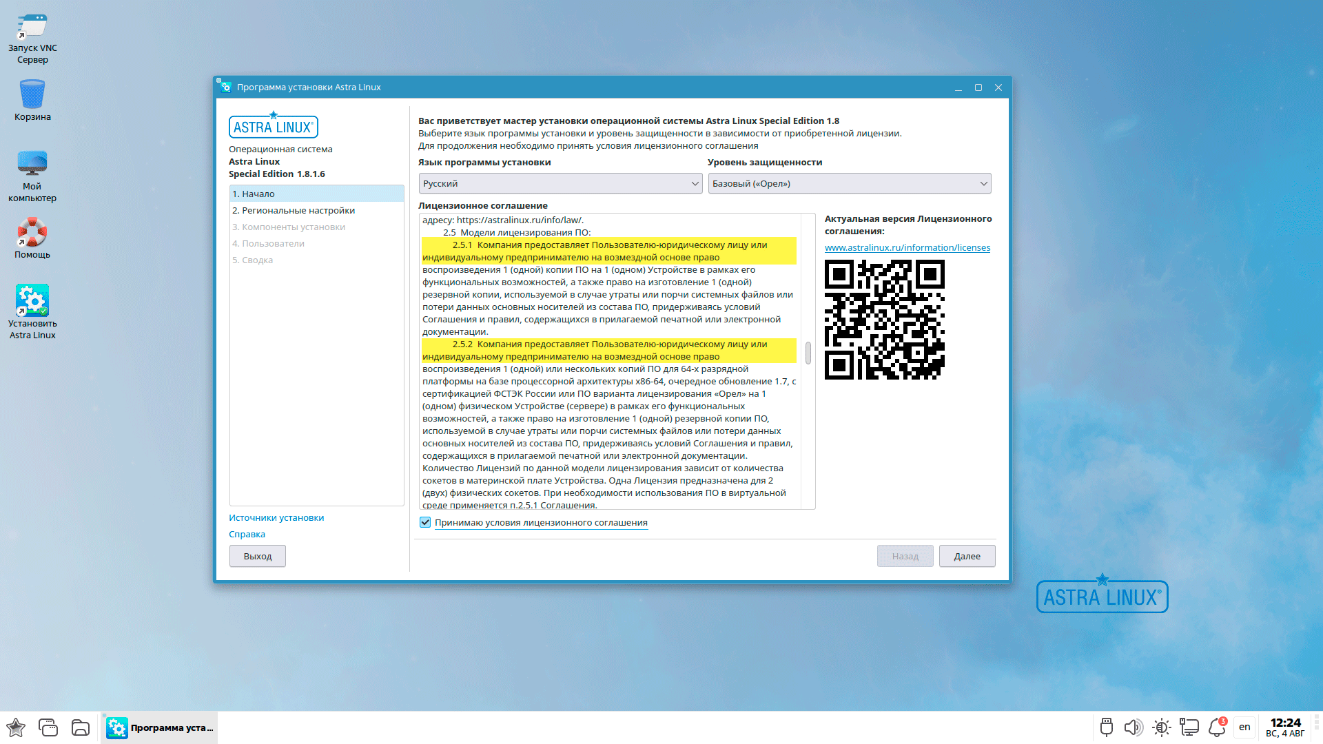 Сам процесс начинается с выбора уровня защищенности. Выбор, уже традиционно, предлагает три варианта: базовый - Орел, усиленный - Воронеж и максимальный - Смоленск. Также сразу следует принять лицензионное соглашение. Сразу обращаем внимание, что лицензирование Astra Linux для физических лиц не предусмотрено, владельцем лицензии может быть только юридическое лицо или индивидуальный предприниматель.