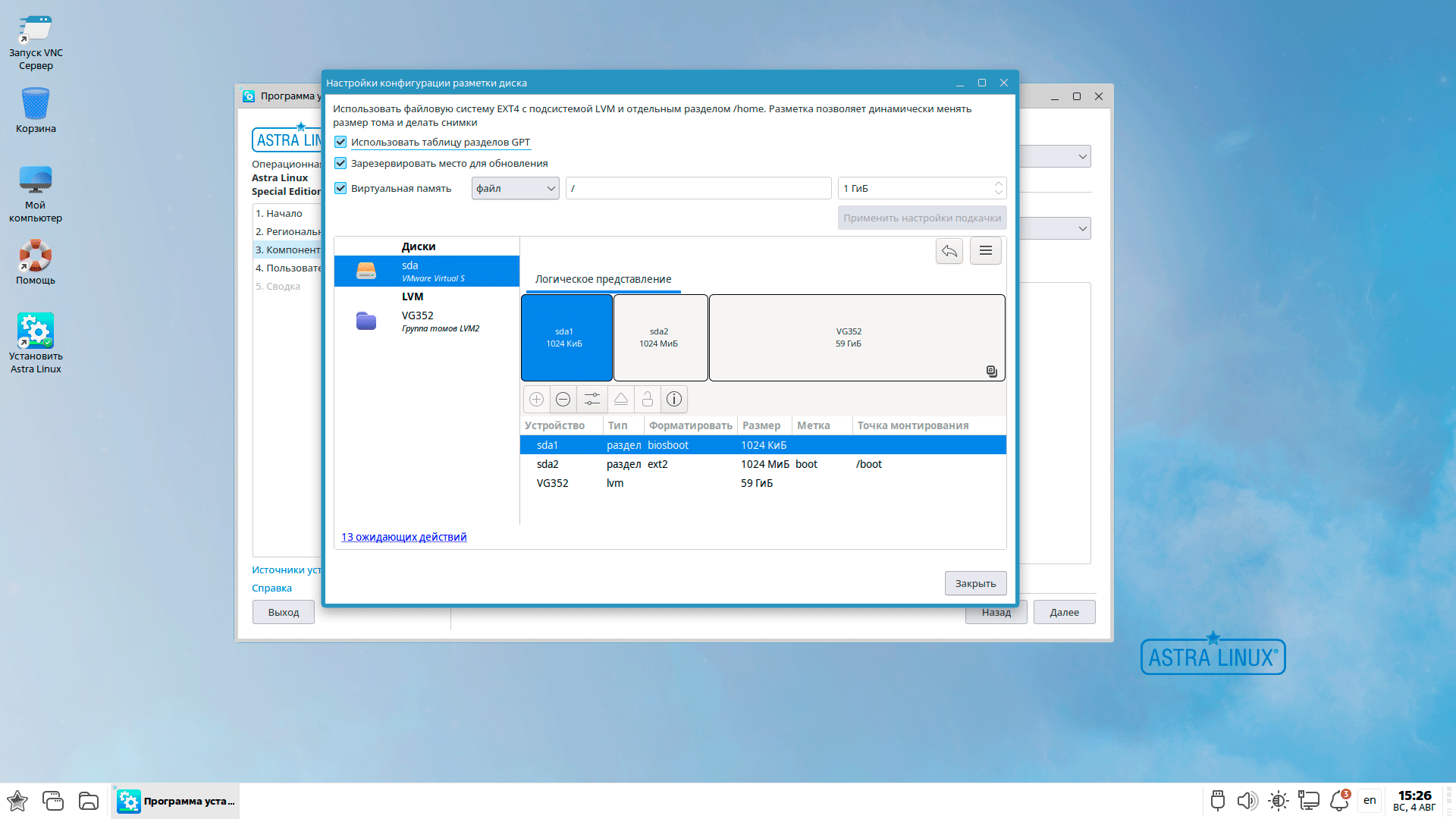 А вот на схеме разметки стоит остановиться подробнее. По умолчанию используется GPT разметка и создаются разделы biosboot и boot или efi и boot, а также LVM-том на всем оставшемся пространстве. Подкачка предполагается в виде файла в корневом разделе, для системы с размером оперативной памяти в 4 ГБ объем файла подкачки был предложен как 1 ГБ.