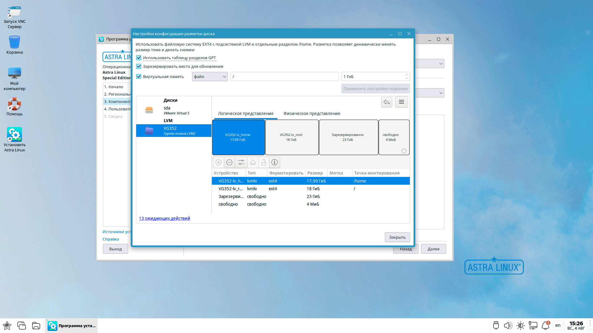 Заглянем теперь внутрь LVM-тома, там мы увидим деление на корневой раздел и /home, а также зарезервированный объем для обновления системы. Официальная документация рекомендует выделять под корневой раздел и резервирование не менее 60 ГБ, у нас же тестовая среда, поэтому мы данным рекомендациям не следуем и вообще откажемся от резервирования. Но в производственных средах так делать не надо. Также появляется нижнее минимальное требование для диска - 240 ГБ (60 ГБ корень + 60 ГБ резерв, остальное на домашнюю директорию), это не официальное требование, но логически проистекает из сказанного выше.