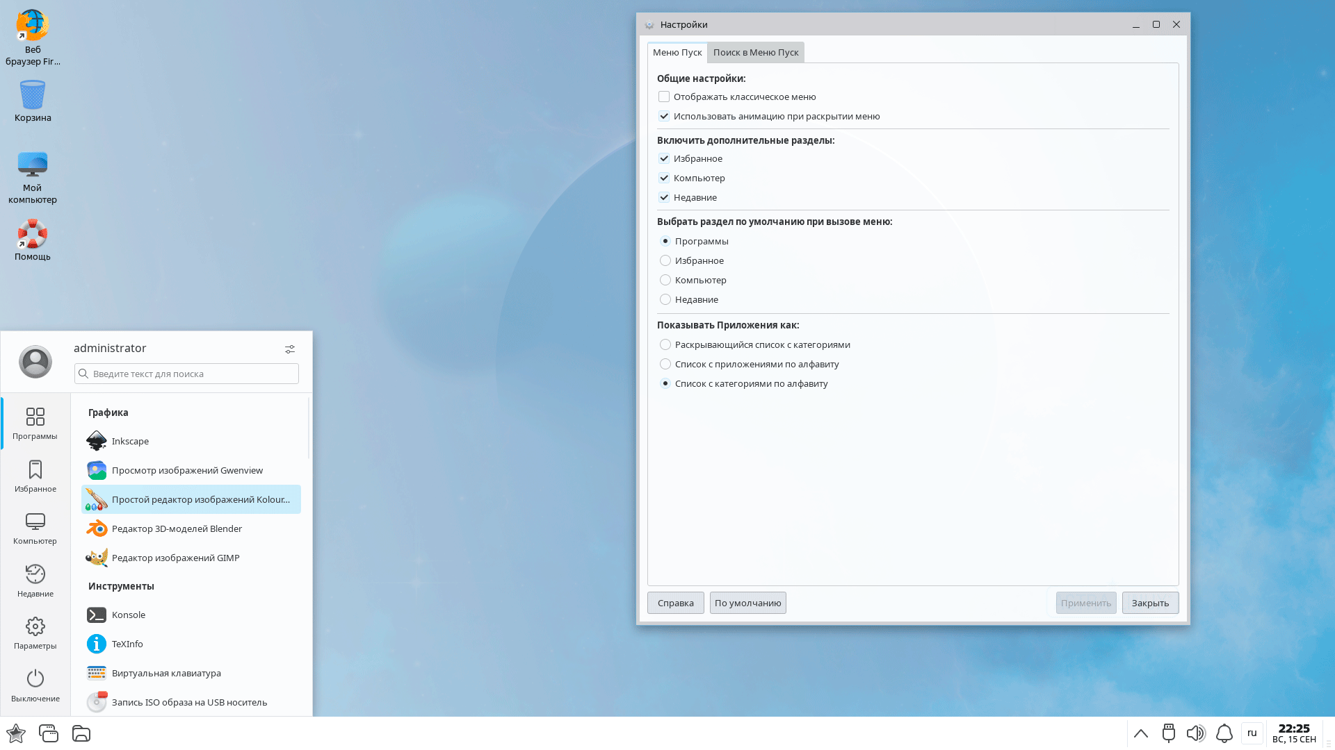 В Astra Linux используется собственная графическая оболочка Fly, основанная на библиотеках KDE и Qt, но, несмотря на то, что данное родство местами проглядывается - это полностью самостоятельная среда рабочего стола. А новый стиль вывел ее на современный и визуально привлекательный уровень. Возможностей для кастомизации тоже много. Если вам не нравится стартовое меню, то можете его изменить. Скажем на классическое, которое, несмотря не его крайне ограниченные возможности все еще пользуется популярностью в определенных кругах.
