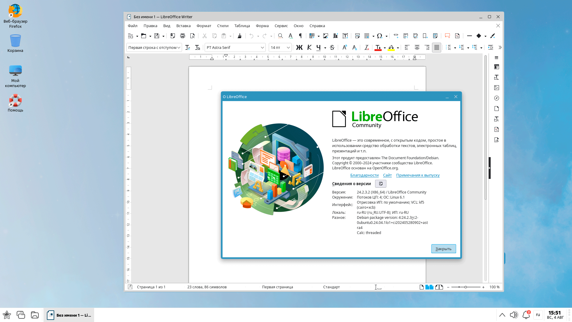 Для работы в интернет по умолчанию установлен браузер Firefox, одновременно с ним предустановлены Chromium и Chromium-Gost, так что при необходимости работать с отечественными порталами и электронной подписью вам не придется что-либо доустанавливать.