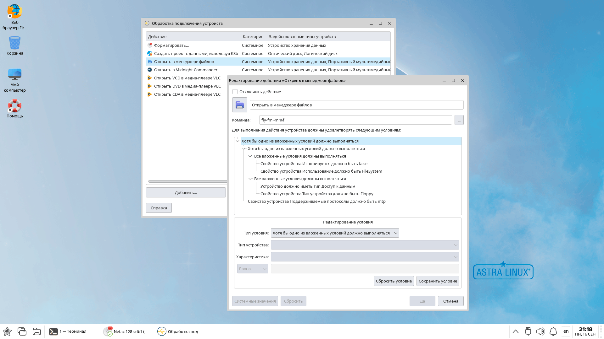Подключение внешних накопителей, даже большого размера не вызывает проблем, сразу появляется всплывающее уведомление с доступными действиями. Так обычный флеш-накопитель мы можем открыть в файловом менеджере, Midnight Commander или просто безопасно извлечь.