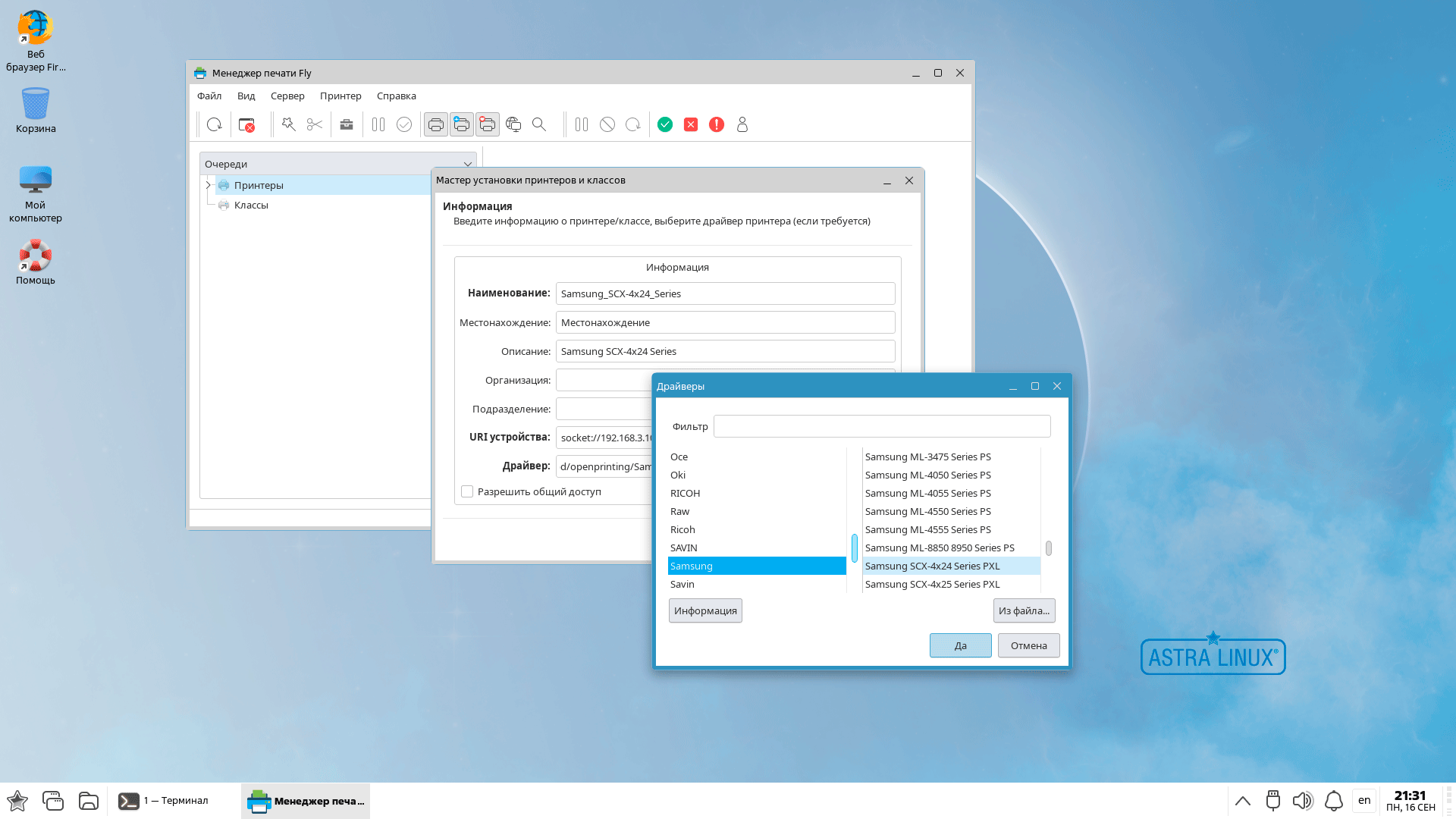Порадовало, что многие пункты настройки выполнены в виде мастеров, например, подключение принтеров, который автоматически обнаружил и установил наш сетевой принтер Samsung, понятно, что не со всеми моделями так легко и просто, но облегчать жизнь там, где это возможно - правильное решение. При этом мы снова держим в уме, что часто администрировать систему будут начинающие Linux-администраторы, особенно в образовании или госсекторе. При этом неприятно удивляет, что в списке драйверов нет массово распространенного и популярного Pantum или той же "Катюши".