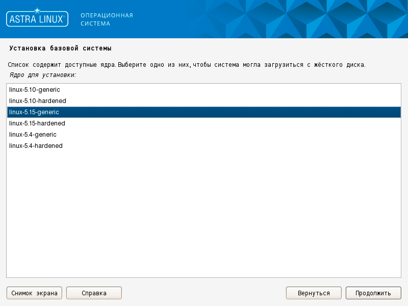 На выбор предлагаются несколько LTS-ядер, от достаточно консервативного 5.4 до актуального 5.15. Ядра представлены в обычном и защищенном вариантах.