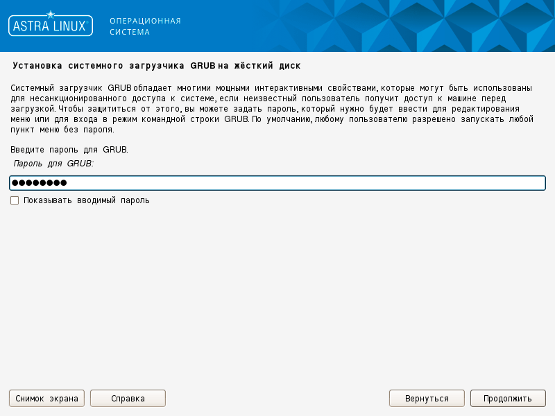 Без установки пароля на меню загрузчика GRUB завершить установку не удастся, но это вполне оправданный шаг и дополнительный уровень безопасности, если кто-то получит доступ к серверу на этом уровне.