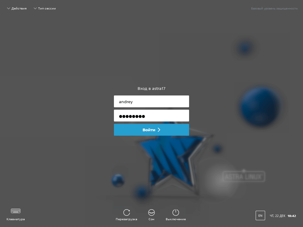 После перезагрузки нас ждет экран входа в систему, перепутать Astra тут с чем-нибудь невозможно. Но все нужные функции здесь есть, все, как и в других дисплейных менеджерах.