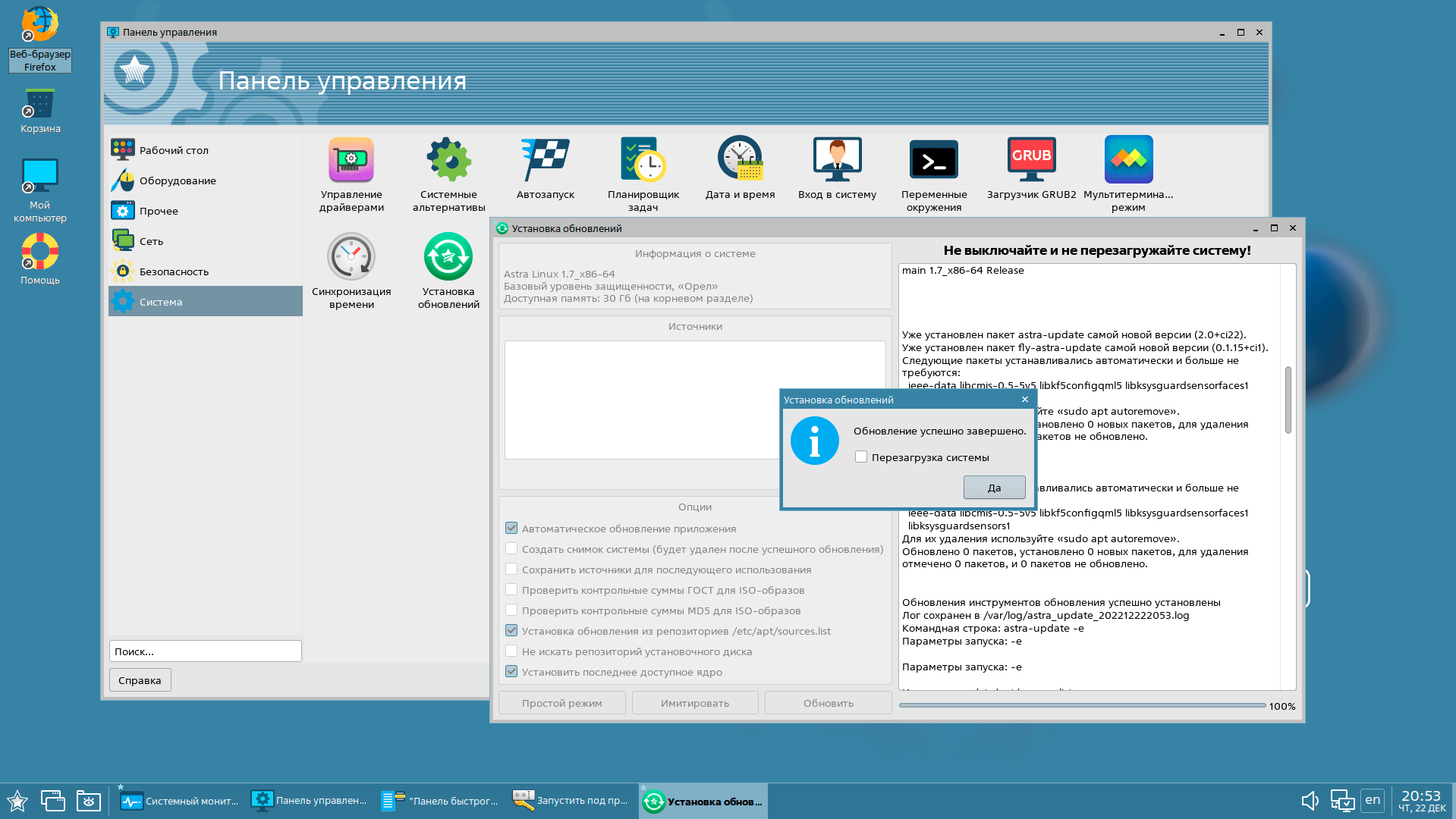 Для того, чтобы обновить систему нам потребуется вручную раскомментировать репозитории в /etc/apt/sources.list, они там есть, но не активны по умолчанию. Это непонятно для привычного пользователя Linux, но вполне оправдано, если мы говорим о защищенных системах. Обновление можно выполнять как в консоли, через apt update / upgrade, так и при помощи фирменной утилиты из Панели управления.