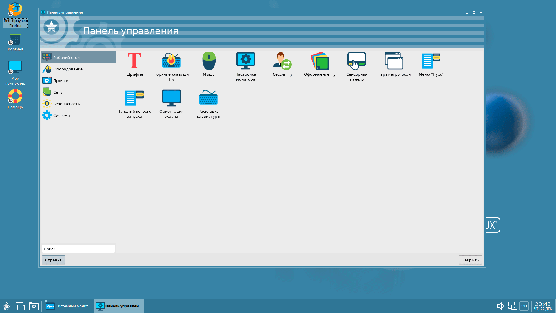 Рабочий стол представлен графической оболочкой Fly собственно разработки, на первый взгляд все достаточно аккуратно и приятно.