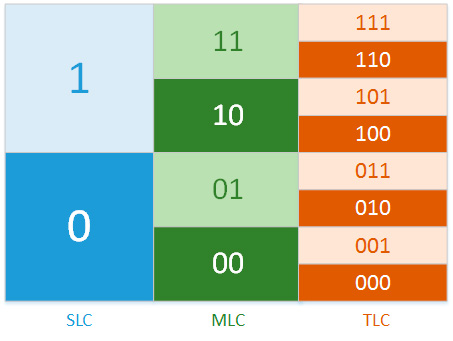 SLC (Single Level Cell, ячейка с одним уровнем)- самый старый тип памяти, одна ячейка хранит один бит информации и отличается двумя значениями напряжения: высокое - логическая 1, низкое - логический 0. Отличается высокой ценой и не менее высоким быстродействием, а также повышенной надежностью. Диски на этом типе памяти не получили широкого распространения из-за высокой стоимости и используются в основном в серверном и высокопроизводительном сегменте.