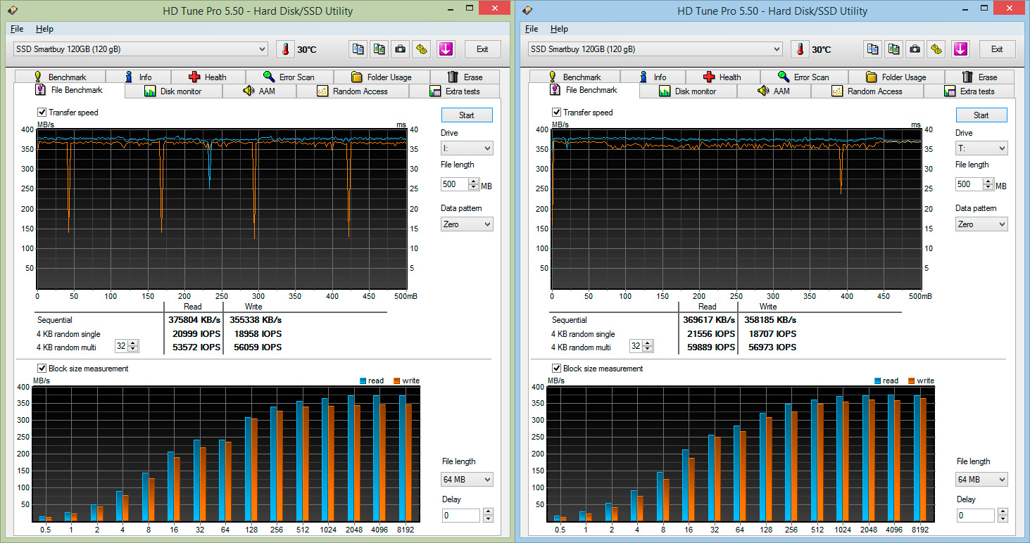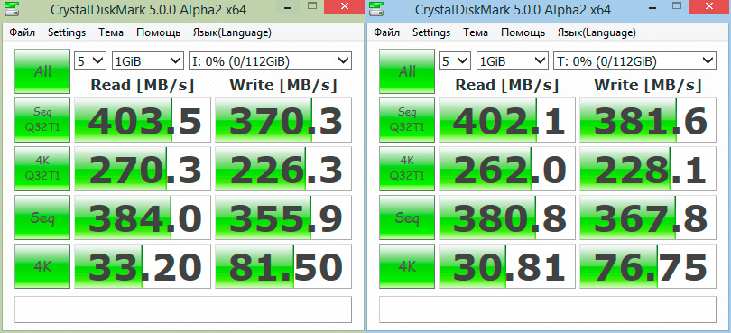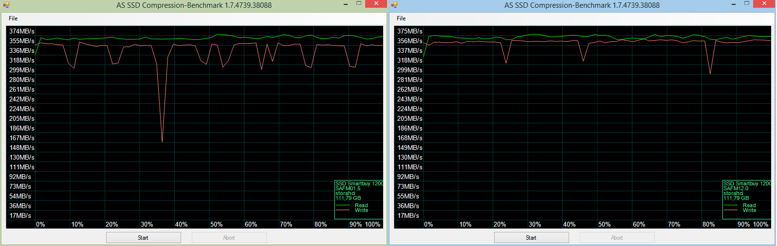 На этот раз оба диска продемонстрировали неплохой результат: 375 МБ/с на чтение и 350 МБ/с на запись. Если сравнивать с результатами Ignition 2, то мы также не заметим разницы. Объясняется это просто, данный тест использует нулевые значения в качестве данных, с которыми контроллер Phison работает особым образом. Ячейки из чистых нулей не пишутся и не читаются в/из флеш-памяти, а помечаются в таблице транслятора, уходя в скрытый резерв. Таким образом данный набор тестов ставит контроллер в идеальные условия и позволяет оценить максимальную производительность именно контроллера, так как фактической записи в память в данном случае практически не происходит.