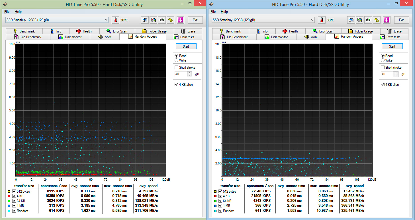 Если на чтение особых сюрпризов нет и результаты совпадают с данными других тестов, то в сценарии случайной записи с глубиной очереди 64 TLC-память показала существенно более низкий результат. Собственно, иного и не ожидалось, для высоконагруженных систем она не подходит. Однако практической ценности данный тест не имеет, так как данные нагрузки характерны для серверных систем и повседневных задачах не встречаются. Можно сказать, что в своей нише оба диска показывают практически одинаковый результат. Если же сравнивать с Ignition 2, то оба диска показывают ощутимо более высокую производительность.