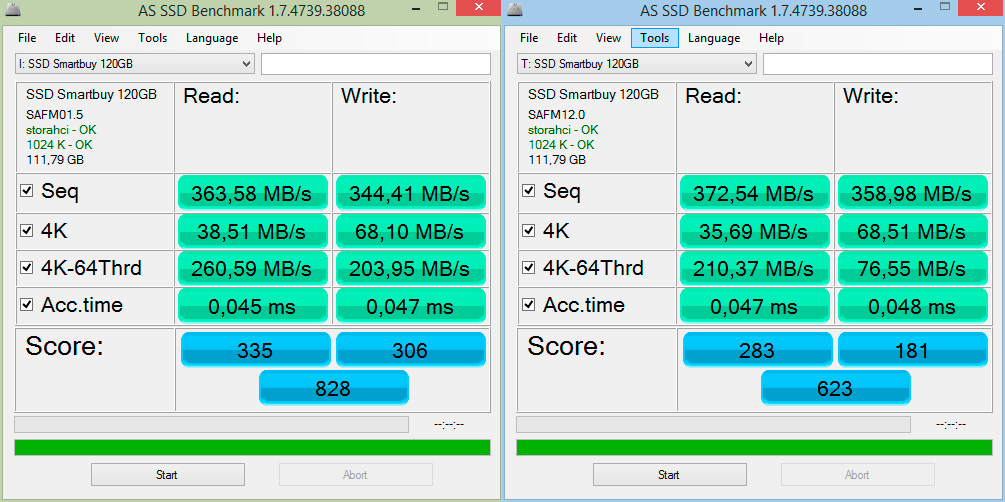 Действительно, SmartBuy Revival SB120GB-RVVL-25SAT3 с ценой в 46 USD выглядит весьма привлекательно, даже на фоне своего ближайшего родственника SmartBuy Ignition 4 SB120GB-IGNT4-25SAT3, который продается в среднем за 51 USD. Контроллер у данных моделей один, разница только в памяти, если Ignition 4, как и Ignition 2, использует привычную для данных моделей память с ячейками MLC, то Revival построена на основе TLC NAND.