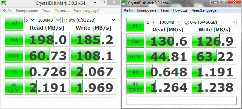 Выглядят оба диска совершенно идентично, снова заставляя нас думать, что перед нами вариации одного и того-же продукта. Посмотрим, что покажут тесты. Начнем, как всегда с CrystalDiskMark (здесь и далее слева 1 ТБ диск, справа 500 ГБ):