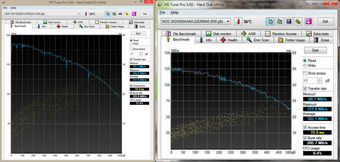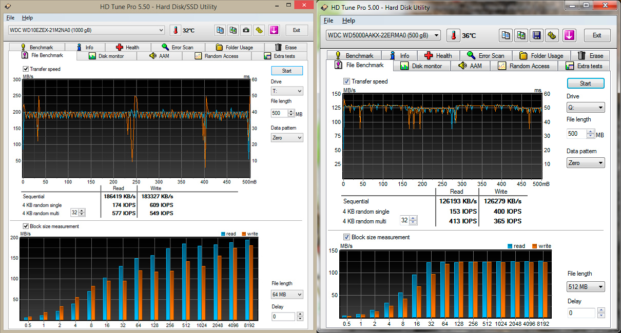 При работе с мультимедийным контентом (HD) и файловых операциях терабайтный диск уверенно уходит в отрыв, а вот при работе с мелкими файлами или типичными офисными сценариями показатели обоих дисков практически одинаковы, разница в большинстве случаев укладывается в погрешность измерения.